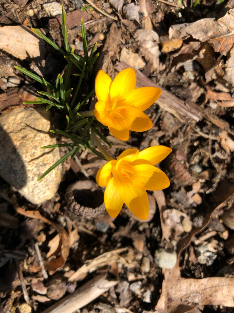 Looking now for early emerging plants like skunk cabbage, mullein, and others are on my mind because we also did the same thing yesterday. I taught a Korean Natural Farming class on gathering and using local ingredients for Fermented Plant Juice extracts to feed our early plants, crops. These little flowers, and some trees adorned with sap buckets, are signs of encouragement.